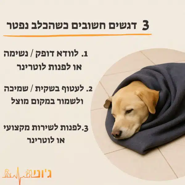 במקרה שהכלב אכן נפטר, יש לטפל בגופו באופן מכבד ובטוח. מומלץ לעטוף את הפגר בשקית גדולה או בסדין נקי, כדי לשמור על היגיינה ולמנוע זיהומים. חשוב לשמור את הגופה במקום מוצל, הרחק מחשיפה ישירה לשמש, כדי למנוע ריקבון מואץ ולשמור על סביבה נקייה. יש להימנע מהנחת הפגר במקום פתוח או חשוף, ולוודא שהמקום נקי ומוגן מפני חיות אחרות או מפגעים סביבתיים. טיפול זה חשוב גם לשיקולים היגייניים וגם לכבוד הכלב שנפטר.